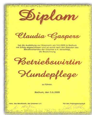 Ich bin seit dem 05.06.2009 ausgebildete Betriebswirtin in Hundepflege.